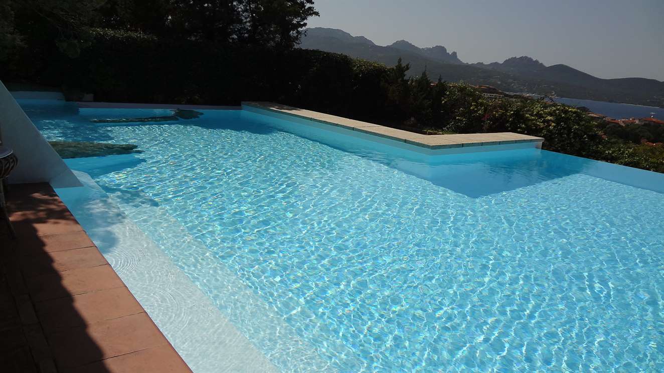 La piscina, realizzata sulla terrazza del lato più panoramico della casa, si affaccia sulla baia ed è dotata di un sistema di idromassaggio.