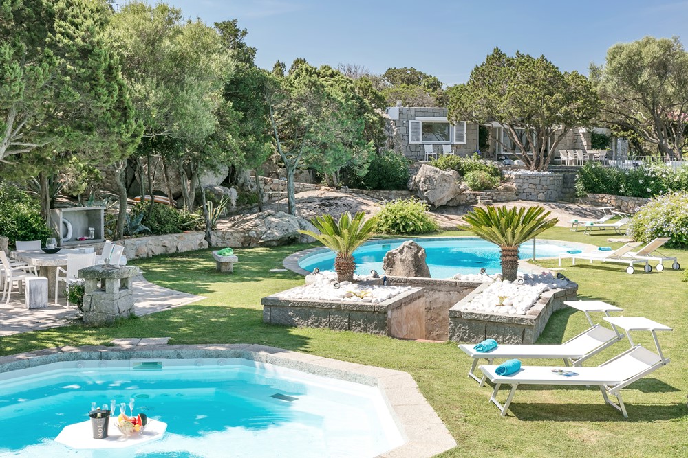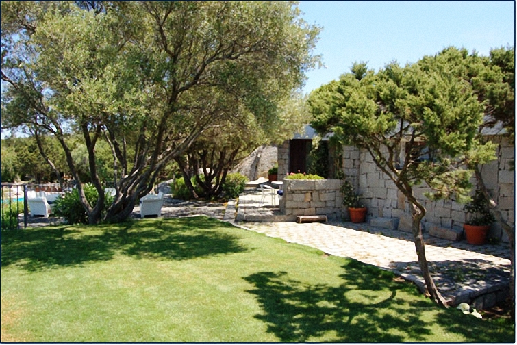 Le varietà piantate sono quelle tipiche della Sardegna, e ciò è dovuto all’amore dei proprietari per la sua natura autoctona che hanno scelto di far fiorire incontaminata, fra viottoli contornati da olivastri, mirti, ginepri, corbezzoli, limoni, aranci, mandarini, cespugli di rosmarino, di gelsomini, bouganville e oleandri di ogni colore, agavi messicane gigantesche, plumbago, melograni, ibiscus, camare, ortensie e malvarose. Il giardino presenta un impianto di irrigazione automatico e un potente impianto di illuminazione che lo rende sicuro e godibile anche di notte, perfetto per romantiche passeggiate al chiaro di luna o per feste fino a tarda notte, godendo della fresca brezza del maestrale, nel silenzio e nella quiete di una villa da sogno.