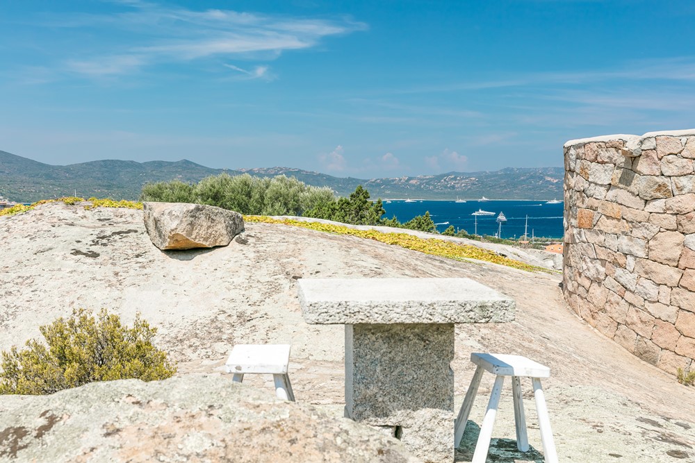 La terrazza del patio è il rifugio perfetto nelle giornate di forte maestrale, quando il vento soffia forte sull’isola, ma in questo angolo riparato si può pranzare e cenare senza scomporsi, sul lungo tavolo che ospita fino a quattordici persone, godendo della meravigliosa veduta su Porto Rotondo attraverso le due vetrate contrapposte che creano un effetto binocolo.