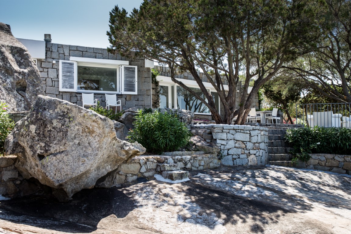 A completamento dell’architettura di questa splendida Villa, troviamo due grandi terrazze, realizzate a partire dagli anni ’60, quando per i lavori di ampliamento della casa furono utilizzate numerose mine per scalfire il gigantesco costone di granito, ottenendo una materia prima preziosa con cui abbellire le mura. Le sapienti mani degli scalpellini Edmondo e Piero Deiana hanno cesellato il granito che adorna la facciata principale della Villa, e molte suppellettili dal valore inestimabile.