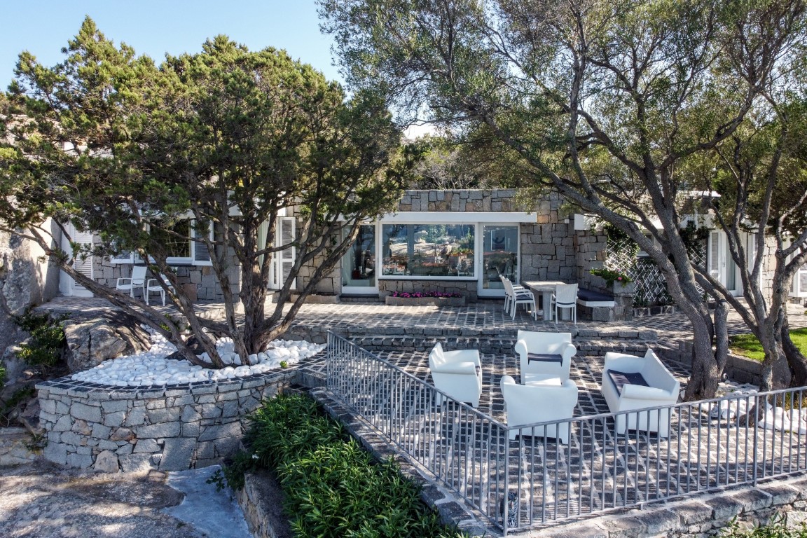 La grande terrazza fronte mare ne possiede uno splendido esempio, un solido tavolo di granito che può ospitare fino a otto persone, protetto da un ampio ombrellone e poco più in basso, scendendo qualche gradino, da un olivastro secolare che dona ombra e crea un angolo perfetto per il relax, con poltrone e sedie di design, firmate da Philippe Starck.